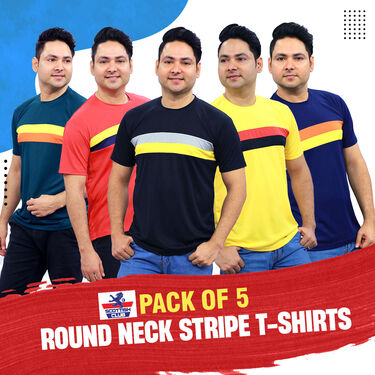 Introducing the Pack of 5 Round Neck Stripe T-shirts (5RT16). These designer t-shirts, featuring a cut and sew pattern, are in high demand for their stylish appeal and easy profit potential. Crafted for versatile use, they offer comfort, durability, and stretchability, making them suitable for all body types. The vibrant colors and patterns effortlessly elevate your casual and activewear wardrobe. The soft feel fabric ensures maximum comfort for all-day wear, while the quick-dry material and easy maintenance add to the convenience. Perfectly adaptable for various occasions, these t-shirts provide a fashionable and comfortable option for anyone seeking a blend of style and ease