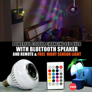 Powerful Colour Changing LED Bulb with Bluetooth Speaker & Remote + Free Night Sensor Light (CBSR8)