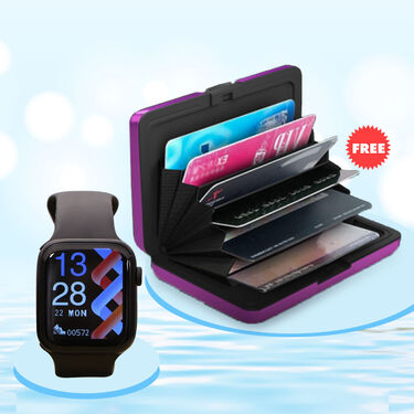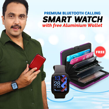 Enhance your daily routine with our premium Bluetooth calling smartwatch, complete with a complimentary aluminum wallet. Crafted with a sleek metal frame and slim design, this full-function smartwatch boasts a 4.04 cm ultra-bright display and capacitive touch screen for effortless navigation. Stay connected on the go with Bluetooth calling capabilities and receive notifications directly on your wrist.With multiple watch faces to choose from, you can personalize your style effortlessly. The included credit card-sized aluminium wallet adds convenience to your daily essentials, while the working knob adds a touch of sophistication. Whether you're tracking fitness goals or staying organized, this smartwatch is designed to elevate your lifestyle with convenience and style. Say hello to a smarter, more connected you with our premium smartwatch and aluminium wallet package