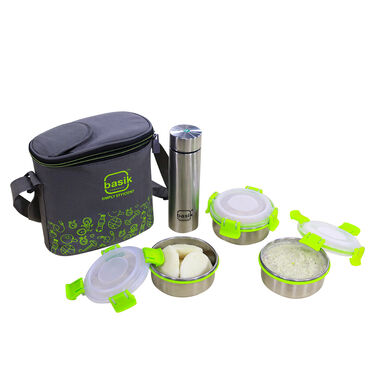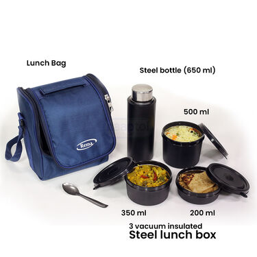 3 Stainless Steel Leak Proof Click & Lock Lunch Box + Bottle + Hot Carry Bag (SCLLBWB)
